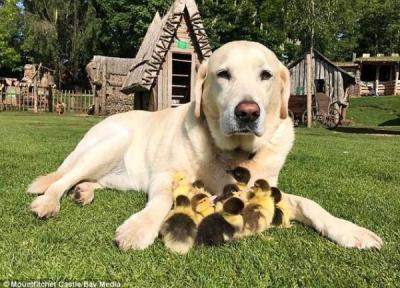 عکس ، این سگ پیر پدرخوانده 9 جوجه اردک شده است