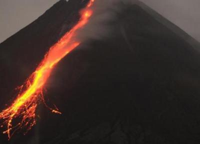 در پی فوران آتشفشان مراپی اندونزی، خاکستر و دیگر مواد آتشفشانی از دهانه آن به بیرون پرتاب می شود.