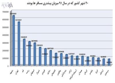 مرکز آمار ایران به تازگی نتایج طرح آمارگیری از گردشگران ایران در سال 91 را منتشر نموده است که بر این اساس در سال گذشته پنج شهر مشهد،تهران،قم،رشت و اصفهان پذیرای بیشترین مسافران در سال 1391 بوده اند.
